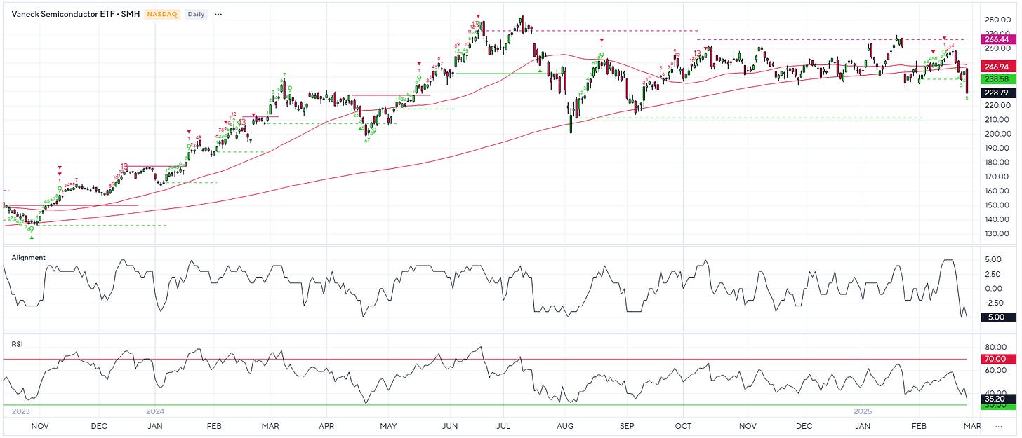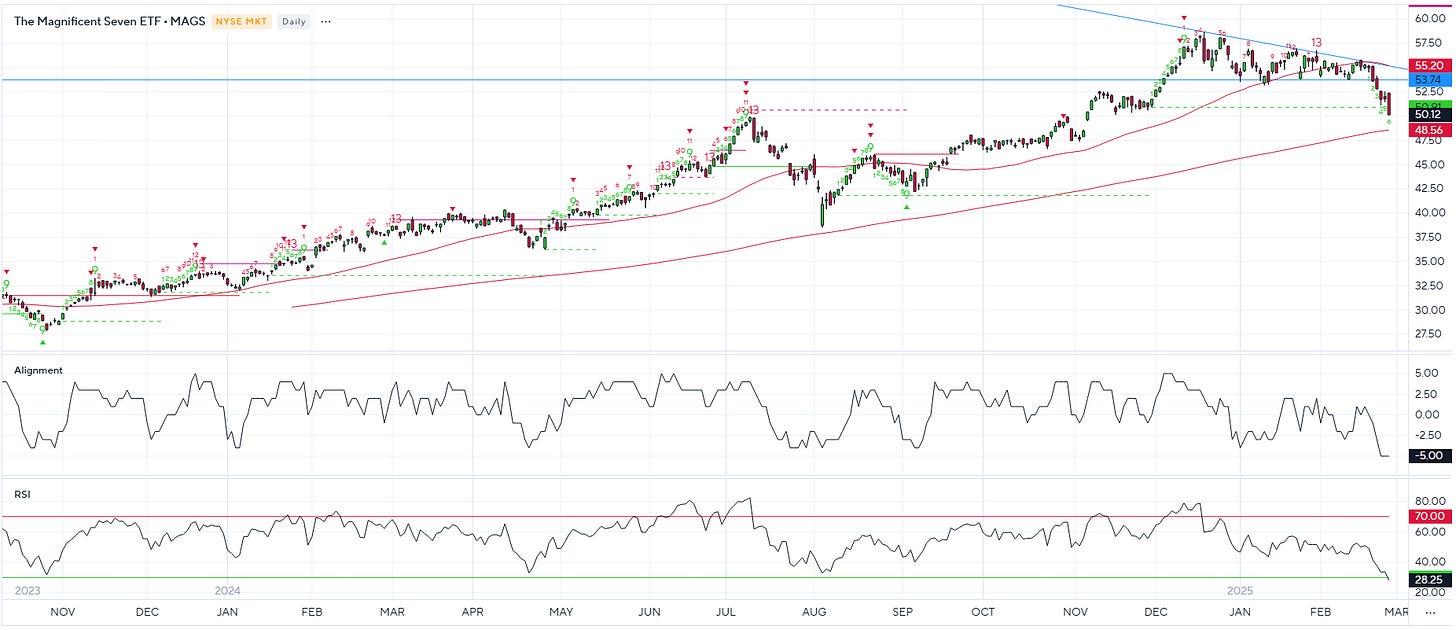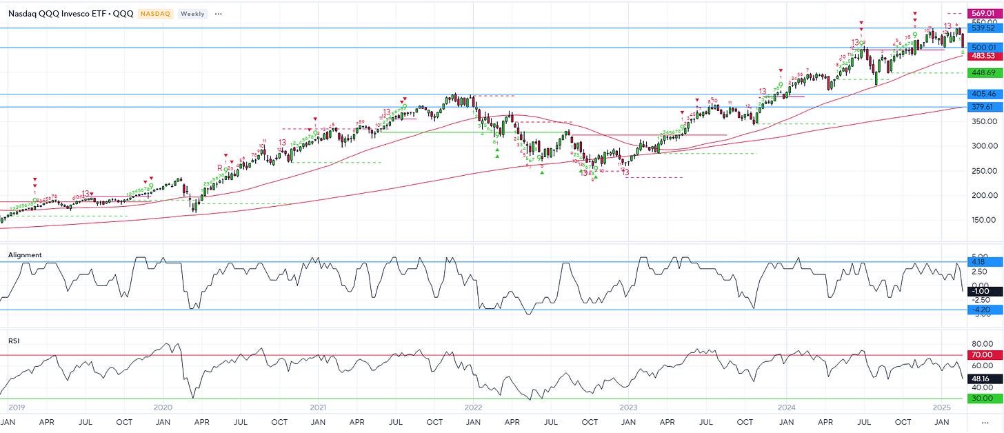Ideally, the plan was to predict the path to $570 perfectly, but the tariff man has thrown a few wretches into this plan. Today, for the second time this year I was riding longs until my 5 TD model flipped to a more bearish stance and along comes another intraday tariff bomb wrecking my position. If you’re finding it difficult to ride short term longs you’re not alone. I think longs will require more patience this year and will be substantially riskier than the past 2 years. As I said in my 2025 outlook shared in December, I expect this year to be down double digits, and it will be led by tech. I have seen nothing that makes me think differently thus far.