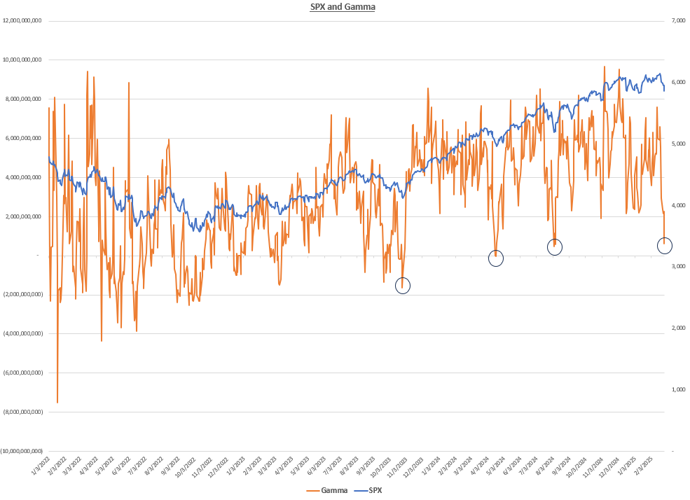 On the plus side, based on where gamma ended today, markets have historically bounced. Of course, this time could be different, and it’s possible it actually is given the level of uncertainty from this new administration.